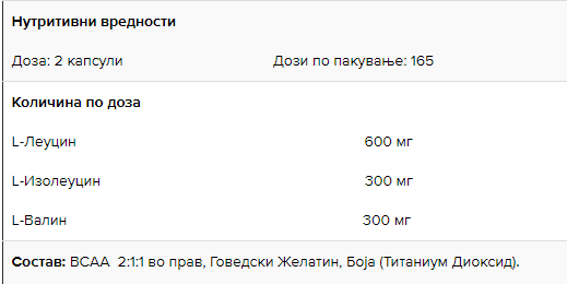 Употреба: Земете 2 капсули, 1-3 пати на ден, пред и по вежбање и за време на катаболични периоди како што е за време на спиењето.