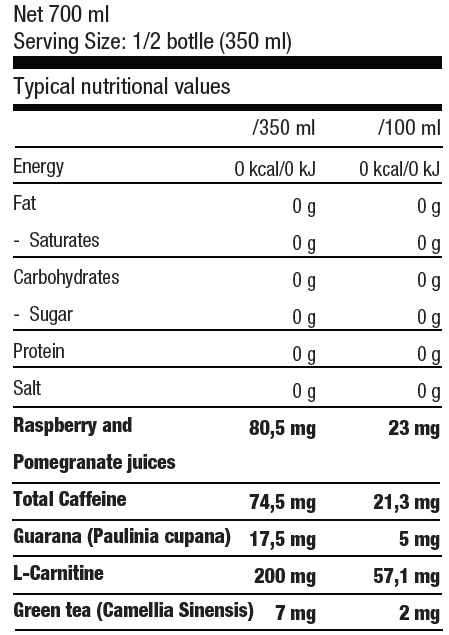 Состојки: вода,средство за регулирање на киселост E330/E331, арома,л карнитин, концентрат од малина и портокал, кофеин, екстрат од зелен чај, засладувач E955