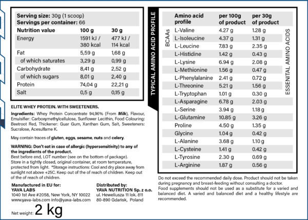 Elite Whey Protein од Yava Labs е висококвалитетен додаток во исхраната кој се користи за зголемување на внесот на протеини во исхраната.