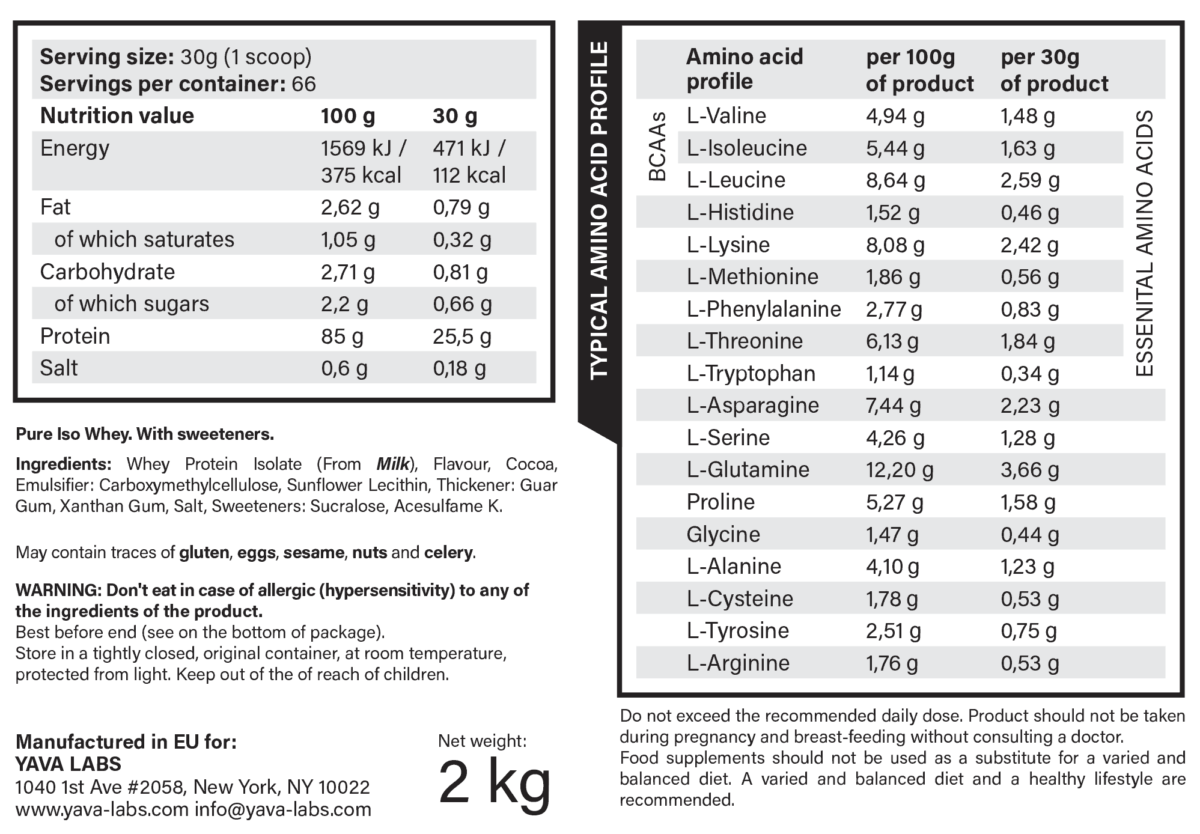 Pure ISO Whey од Yava Labs е висококвалитетен изолат на протеин од сурутка. Супериорната формула за изолат на протеин од сурутка е дизајнирана да го подобри градењето мускулна маса, да го забрза времето на закрепнување и да ги оптимизира атлетските перформанси. Протеинскиот додаток овозможува брзо снабдување со амино киселини во циркулација поради неговото брзо разградување и апсорпција. Висококвалитетниот производ е исто така сертифициран со ISO и без наркотици, што го прави погоден за човечка исхрана. Производот е корисен после тренинг и други физички активности. Денес, Whey PURE ISO се издвојува како еден од најпродаваните протеински прашоци поради неговите уникатни и брзи ефекти врз телото за враќање на изгубената енергија.